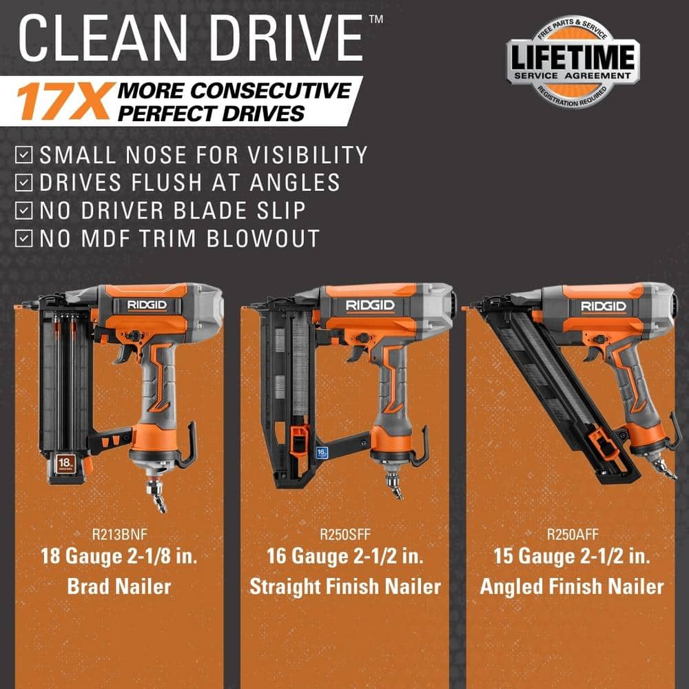 RIDGID introduces the 18-Gauge 2-1/8 in. Brad Nailer with CLEAN DRIVE Technology, Tool Bag, and Sample Nails. This 18-gauge brad nailer features CLEAN DRIVE Technology, which boasts 17X more consecutive perfect drives than the competition. CLEAN DRIVE Technology means you can spend less time fixing and more time working. With registration, this nailer is backed by the Industry's Only Lifetime Service Agreement. Included with the 18-Gauge 2-1/8 in. Brad Nailer are a tool bag, and an operator operator's manual.