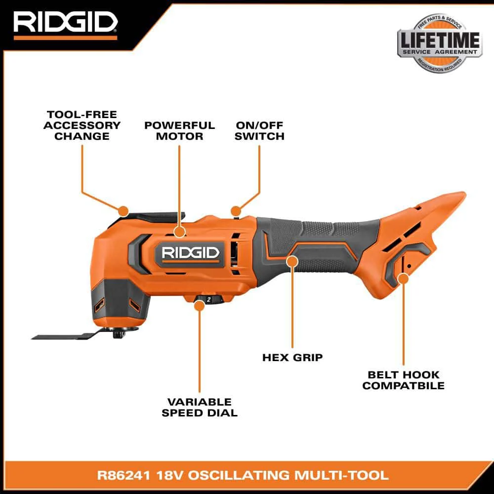 RIDGID introduces the R86241B 18V Cordless Oscillating Multi-Tool. The powerful motor in this 18V cordless oscillating multi-tool gives users the ability to make fast, precise cuts through drywall, wood, metal, and handle a variety of other jobsite materials. The RIDGID 18V Cordless Oscillating Multi-Tool delivers up to 20,000 oscillations per minute (OPM) and is controlled by an easily accessible variable speed dial giving users ultimate control to match speed to any application. Built with maximum productivity in mind, this 18V oscillating multi-tool features a tool-free accessory change design and is compatible with the most multi-tool accessories. As always, this RIDGID 18V Oscillating Multi-Tool is 100% compatible with all RIDGID 18V batteries. Best of all, this tool is backed by the Industry's Only Lifetime Service Agreement, simply register within 90 days of purchase for FREE Parts, Free Service, For LIFE. The R86241B includes the Cordless Oscillating Multi-Tool, Sanding Pad, Sandpaper, Segment Saw Blade, Flush Cut Blade, and Operator's Manual. Batteries and charger sold separately.