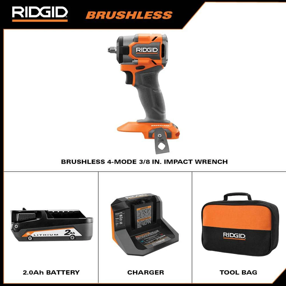 RIDGID introduces the 18V SubCompact Brushless 4-Mode 3/8 in. Impact Wrench Kit. The RIDGID SubCompact Brushless lineup pairs powerful brushless motor technology in a compact tool design. This 3/8 in. Impact Wrench is the industry’s most compact, delivering 250 ft./lbs. of breakaway torque. Built with 3 speeds and an auto tightening mode, users can adjust speed and power for added control. This brushless impact wrench utilizes auto-tightening mode to automatically stop when fastening bolts to prevent over tightening. In reverse, this mode delivers full breakaway torque, then stops when the bolt is loose. It features a Tri-Beam LED light that enhances visibility and provides an even distribution of light, making it ideal for working in low-light conditions. As always, this RIDGID 18V SubCompact Brushless 4-Mode 3/8 in. Impact Wrench is 100% compatible with all RIDGID 18V batteries. Best of all, this tool is backed by the Industry’s Best Lifetime Service Agreement, simply register within 90 days of purchase for FREE Batteries, FREE Parts, FREE Service, FOR LIFE. The RIDGID SubCompact Brushless Impact Wrench includes the 18V Brushless 4-Mode 3/8 in. Impact Wrench, 2.0 Ah battery, charger, belt hook with screw, and tool bag.