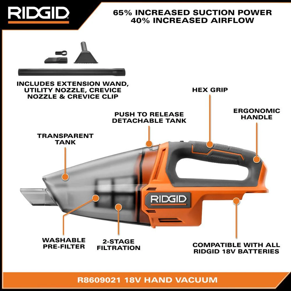 RIDGID introduces the R8609021 18V Hand Vacuum (Tool Only). With over 40% increased airflow and 65% increased suction power, the RIDGID 18V Hand Vacuum easily tackles the toughest jobs. Thanks to an assortment of included attachments, this new Hand Vacuum can assist in a wide variety of cleaning needs on a worksite or at home. The push to release detachable tank prevents accidental emptying and minimizes downtime by allowing debris to be quickly removed. Also, with a transparent tank, users know exactly when to empty and clean the tank to keep the tool running at peak performance. More so, the large tank capacity reduces the frequency of tank emptying and keeps the vacuum running for longer. The RIDGID 18V Hand Vacuum uses 2 stage filtration, with a washable and reusable pre-filter, ensuring the Hand Vacuum maintains maximum cleaning efficiency. The enhanced ergonomics on this tool allows users to comfortably clean for longer periods of time. As always, the RIDGID 18V Hand Vacuum is 100% compatible with all RIDGID 18V batteries. Best of all, this tool is backed by the industry’s best Lifetime Service Agreement, simply register within 90 days of purchase for FREE Parts, Free Service, For LIFE. The R8609021Hand Vacuum includes the vacuum, extension wand, utility nozzle, crevice nozzle, crevice clip and Operator's Manual. Batteries and charger sold separately.