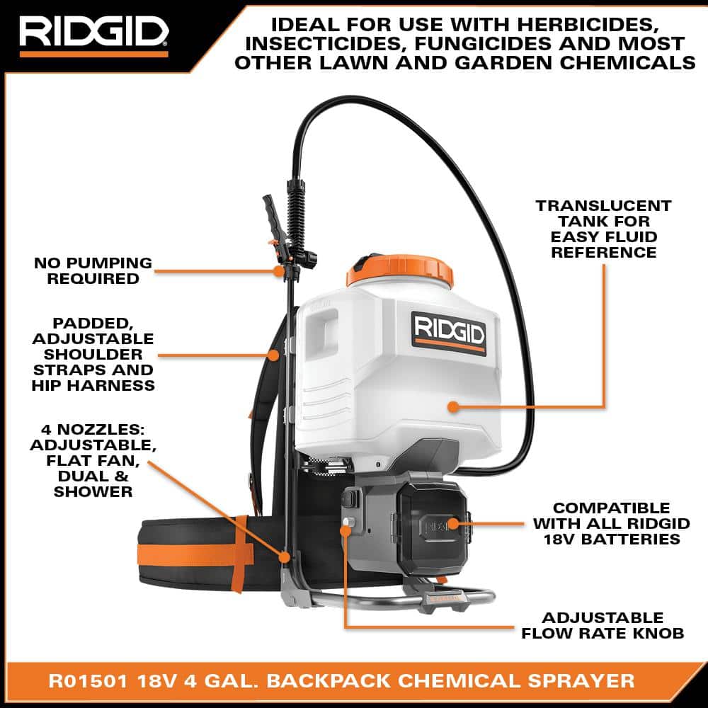RIDGID introduces the R01501K 18-Volt 4 Gal. Backpack Chemical Sprayer Kit. This sprayer delivers 105 Gal. per charge with no pumping required. It is equipped with an adjustable flow rate knob for precise application delivering up to 105 PSI and 37 ft. spray distance. This sprayer includes 4 nozzles for versatile spraying: adjustable, flat fan, dual, and shower. The RIDGID backpack sprayer has a comfortable backpack design with padded, adjustable shoulder straps and hip harness. With a translucent tank, users can easily reference fluid level. The sprayer is ideal for use with herbicides, insecticides, fungicides, and most other lawn and garden chemicals. As always, this RIDGID 18-Volt 4 Gal. Backpack Chemical Sprayer Kit is 100% compatible with any RIDGID 18-Volt batteries. Best of all, this kit is backed by the Industry's Best Lifetime Service Agreement, simply register within 90-days of purchase for FREE parts, FREE service, FOR LIFE. The R01501K includes the 4 Gal. Backpack Chemical Sprayer, 2.0Ah battery, charger, adjustable nozzle, flat fan nozzle, dual nozzle, and shower nozzle.