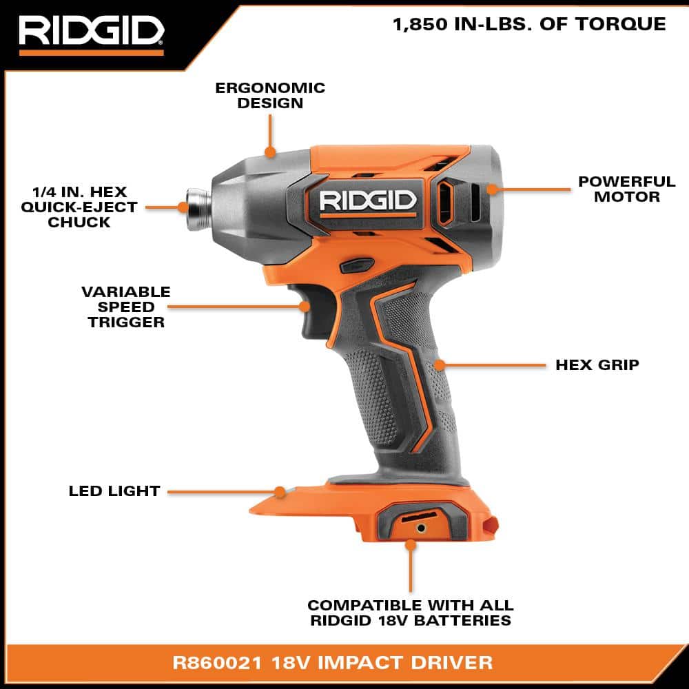 RIDGID introduces the R860021B 18V Cordless Impact Driver (Tool Only). This impact driver features a powerful motor, delivering 1,850 in./lbs. of torque and speeds up to 2,800 RPM via variable speed trigger. The 1/4 in. hex quick-eject chuck allows users to quickly insert and remove bits using one hand. Built with the end user in mind, its ergonomic design reduces user fatigue and can stand up to all day use on the jobsite. The added LED light improves visibility in low-light situations. As always, this RIDGID 18V Impact Driver is 100% compatible with all RIDGID 18V batteries. Best of all, this tool is eligible for the Industry's Best Lifetime Service Agreement, simply register within 90 days of purchase for FREE Parts, FREE Service, FOR LIFE. The RIDGID Impact Driver includes the R860021 18V Impact Driver, and driving bit. Battery and charger sold separately.