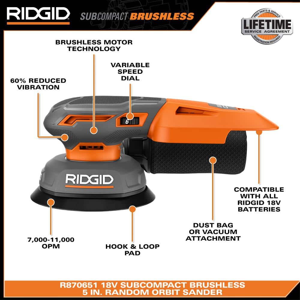 RIDGID introduces the R870651B 18V SubCompact Brushless 5” Random Orbit Sander (Tool Only). The RIDGID SubCompact Brushless lineup pairs powerful brushless motor technology in a compact tool design. As the industry’s most compact random obit sander, the low-profile design gives users more control close to the work surface for precise sanding. The powerful brushless motor delivers fast material removal with variable speeds of 7,000-11,000 OPM. This allows users to adjust the removal rate to their specific application. Experience 60% reduced vibration for increased control and enhanced comfort during extended use. As always, this RIDGID 18V SubCompact Brushless Random Orbit Sander is 100% compatible with all RIDGID 18V batteries. Best of all, this tool is eligible for the Industry's Best Lifetime Service Agreement, simply register within 90 days of purchase for FREE Parts, FREE Service, FOR LIFE. The R870651B 18V SubCompact Brushless Random Orbit Sander also includes (2) 80 Grit Hook and Loop Sandpaper, and Dust Bag. Battery and charger sold separately.